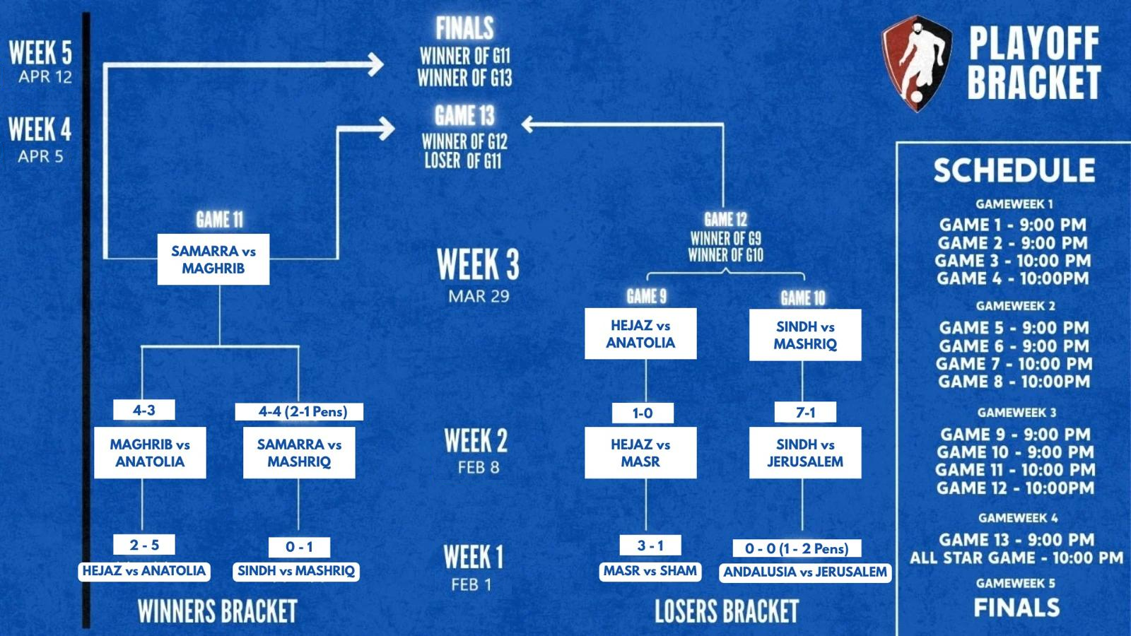 10PM: Sharq #1 (Samarra) v Gharb #4 (Masr) Field 1, Sharq #2 (Jerusalem) v Gharb #3 (Andalusia) Field 4